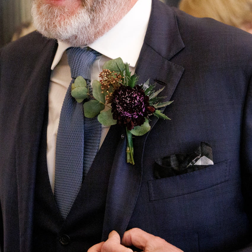 Her bridal bouquet was mainly formed from leucadendron, skimmia, and carnations in a rich bordeaux and forest green, and the buttonholes featured green carnations, leucadendron, and dark helichrysums with lots of foliage.