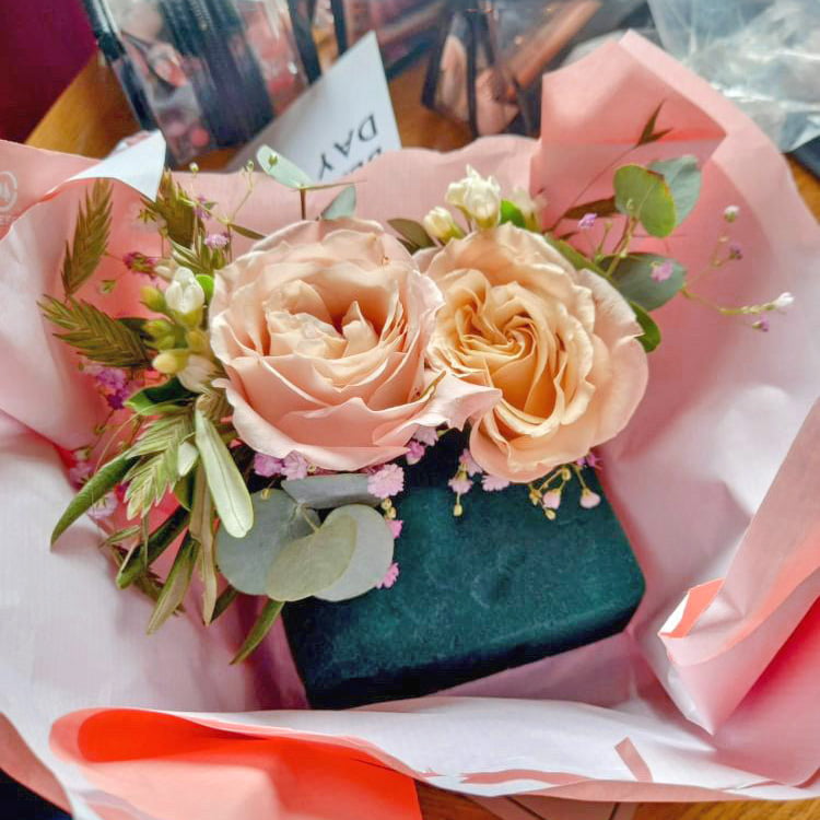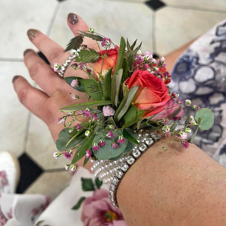 They also ordered a corsage, which we formed from roses in a pretty blush pink, purple and white mimosa, and a selection of greenery, and a buttonhole, featuring two peachy roses, along with the same mimosa and greenery combination.