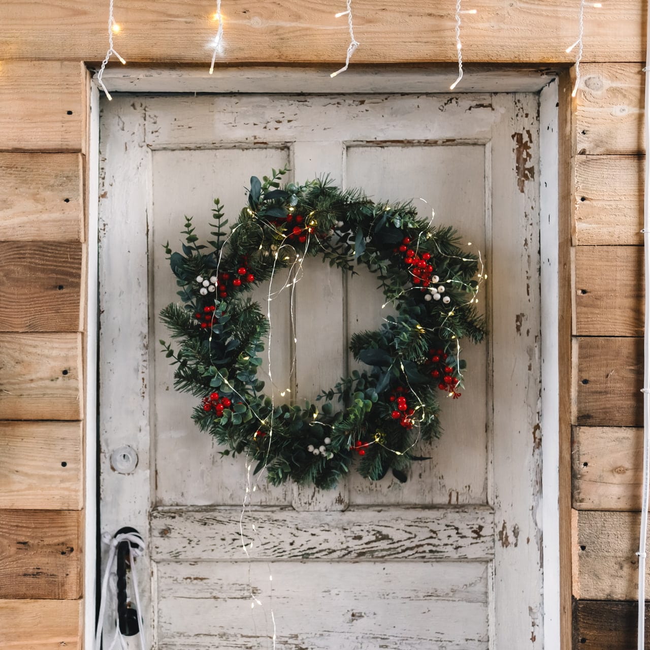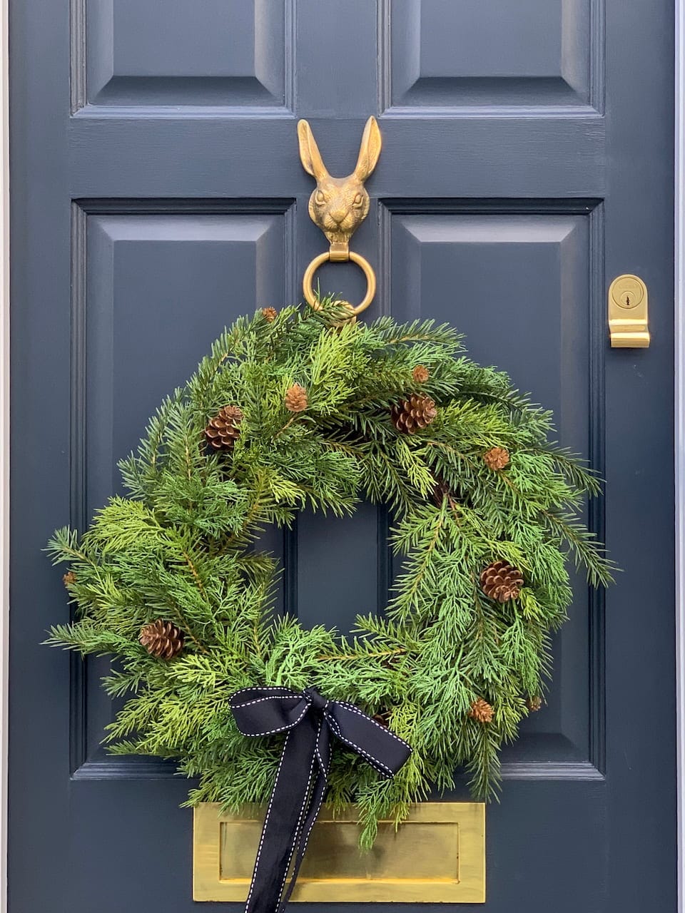 If you already have a door knocker on your door which will hold a wreath, this is the best possible option. It’s sturdy enough to hold the weight of the wreath and doesn’t require fixing anything to the door, so no extra work! You can either hang the wreath directly onto the knocker, or suspend it from string or ribbon hanging from the knocker.