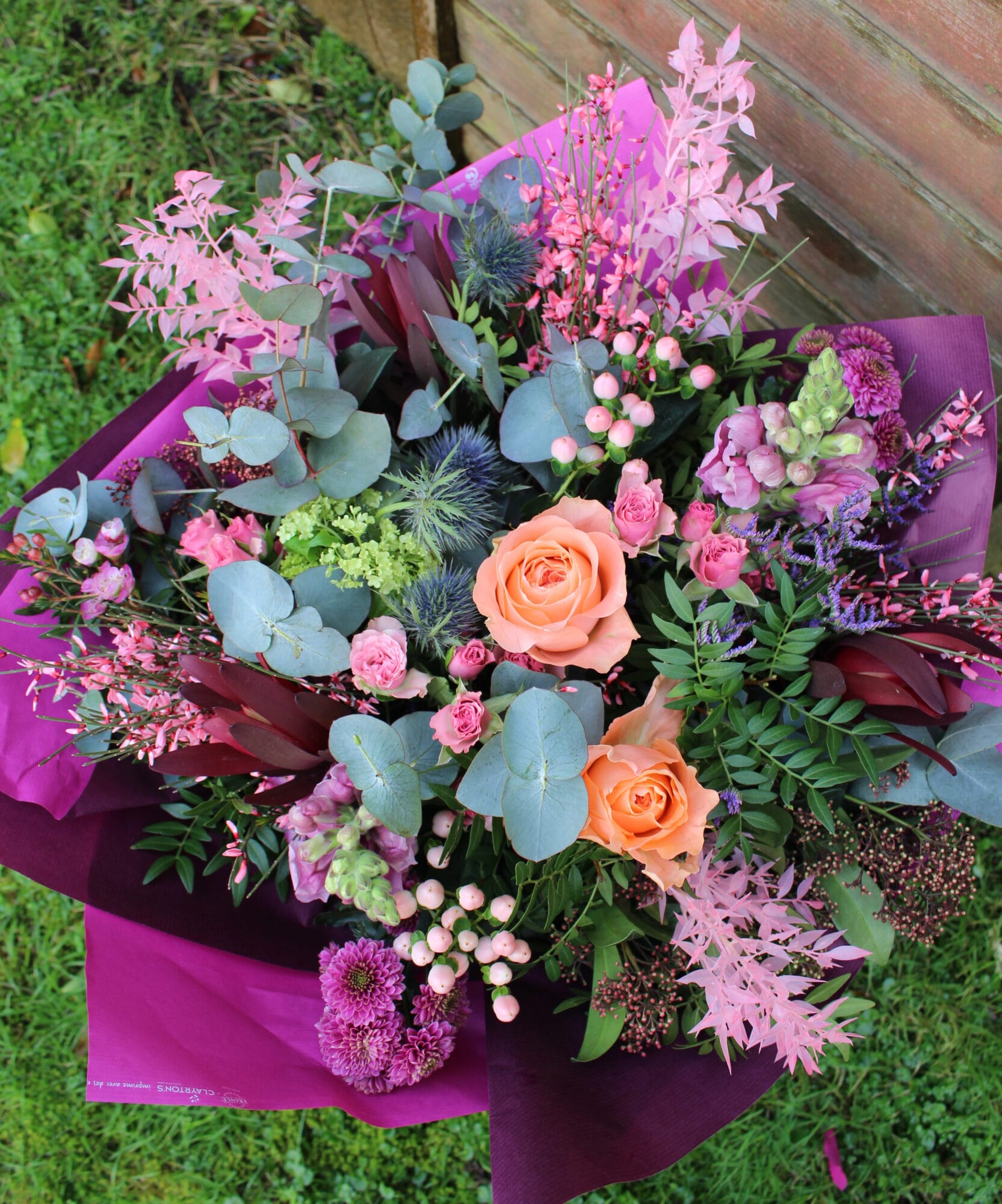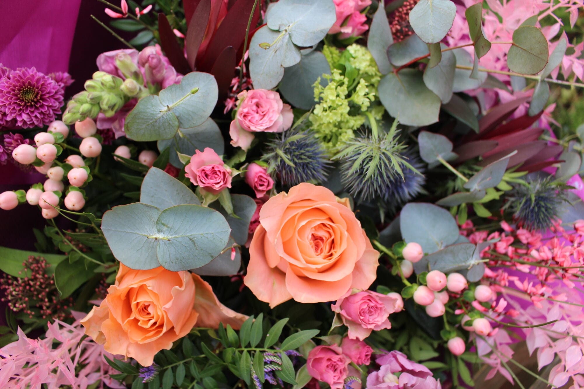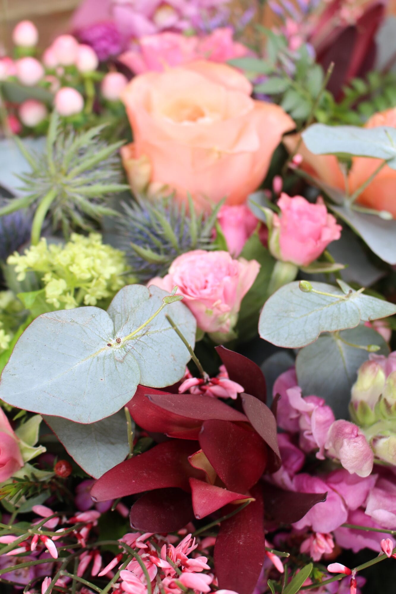Clouds of pistachio and eucalyptus create a fresh, fragrant base, layered with burgundy skimmia, delicate pink wax flower and bright pink genista. Peach roses and blush spray roses bring warmth, while lilac limonium, pale pink hypericum and snapdragons add gentle texture. Blue thistle and viburnum weave through the design for contrast, alongside safari sunset leucodendron, magenta chrysanthemum and touches of dyed pale pink ruscus for a softly romantic finish.