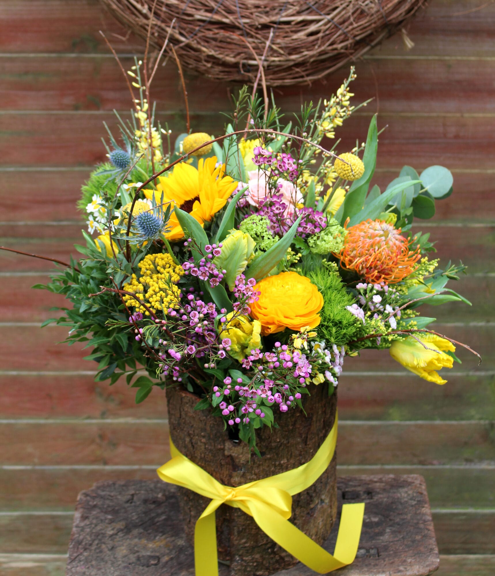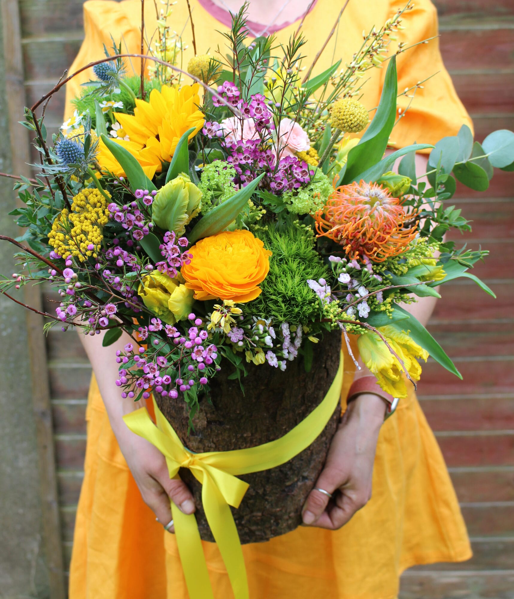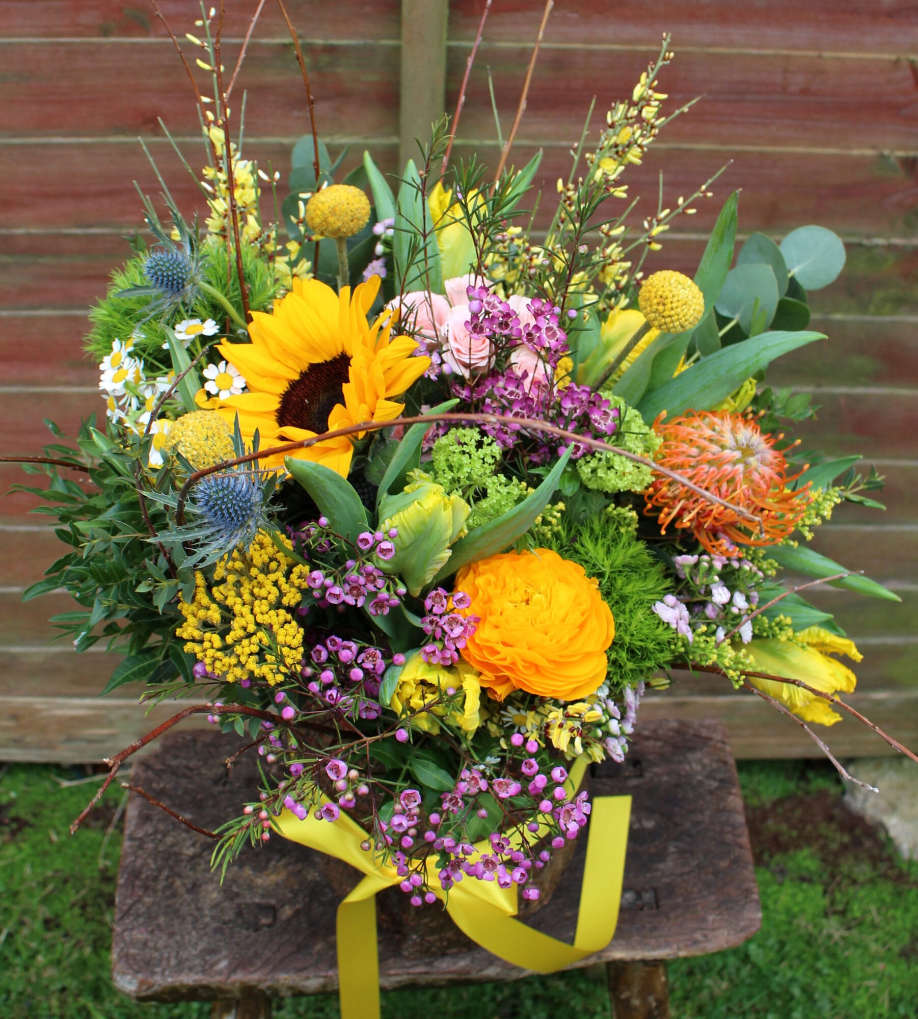 Each arrangement is created using a lively mix of blooms and textures - in the arrangement pictured, you'll find: cheerful sunflowers, sculptural leucospermum, delicate wax flower, playful craspedia, airy ammi, and the soft, ruffled beauty of ranunculus and parrot tulips. You may also spot thistles, achillea, september flower and other delightful surprises tucked among the foliage. Together they create a bouquet that feels fresh, abundant and a little bit wild — like a joyful wander through a summer garden.