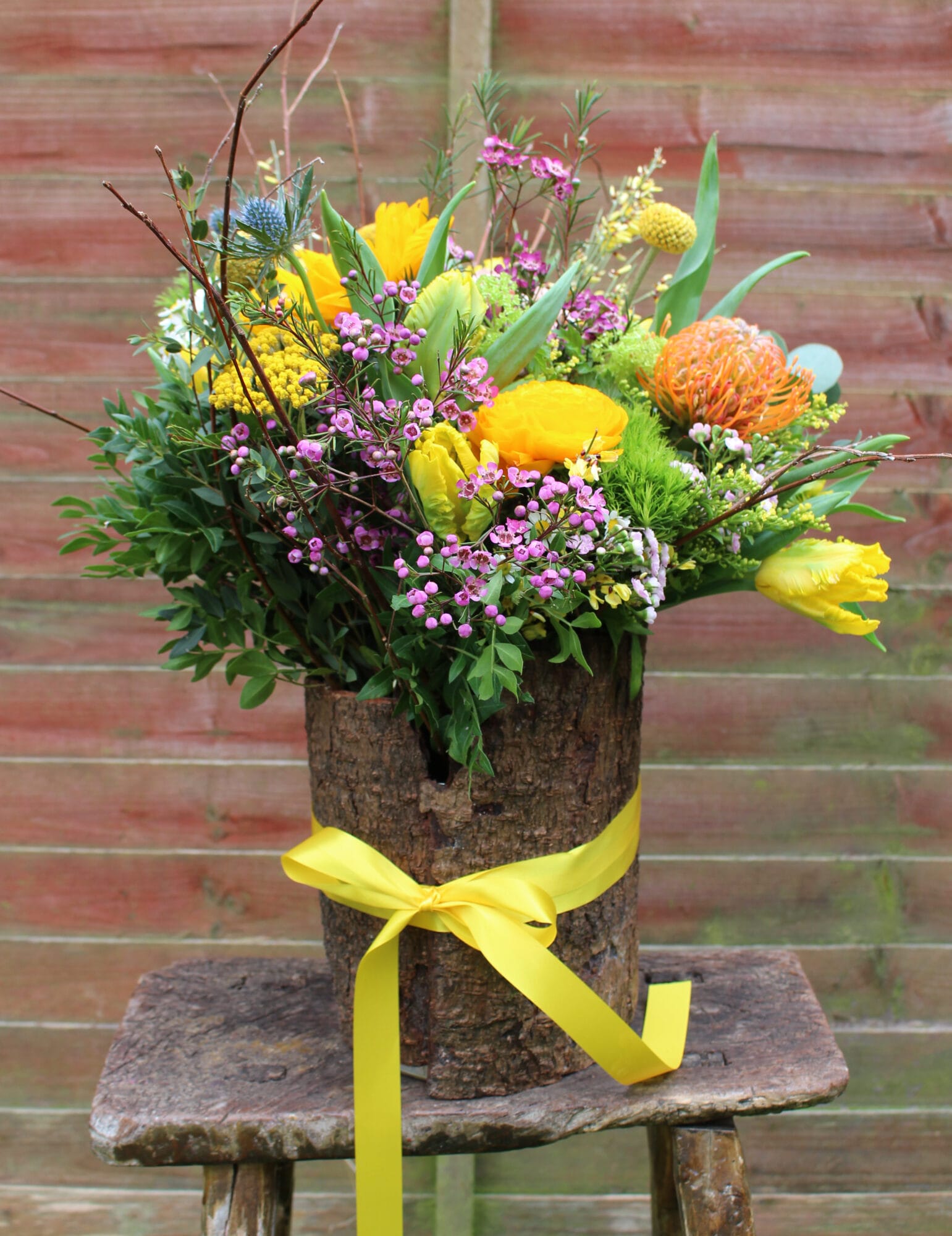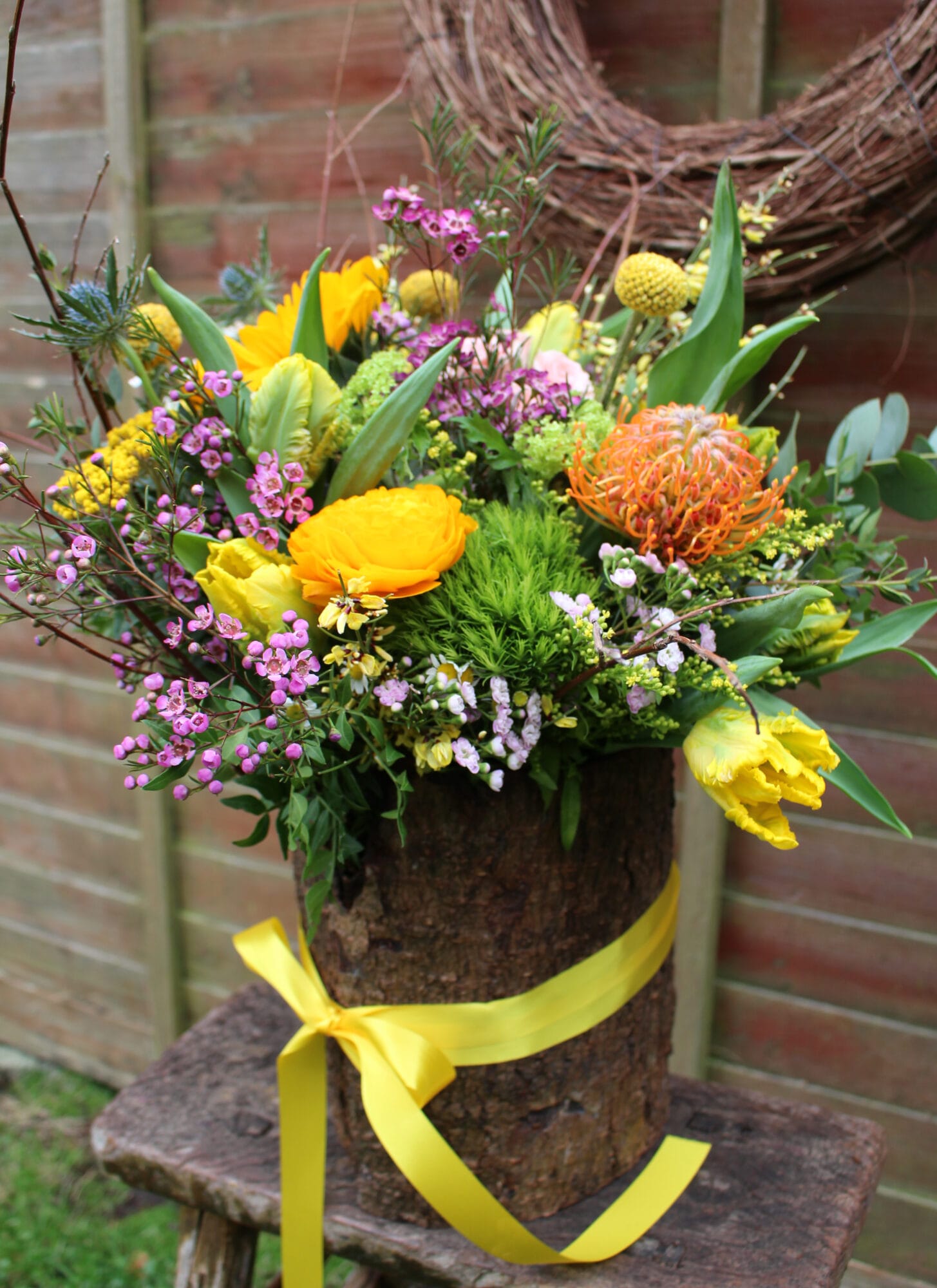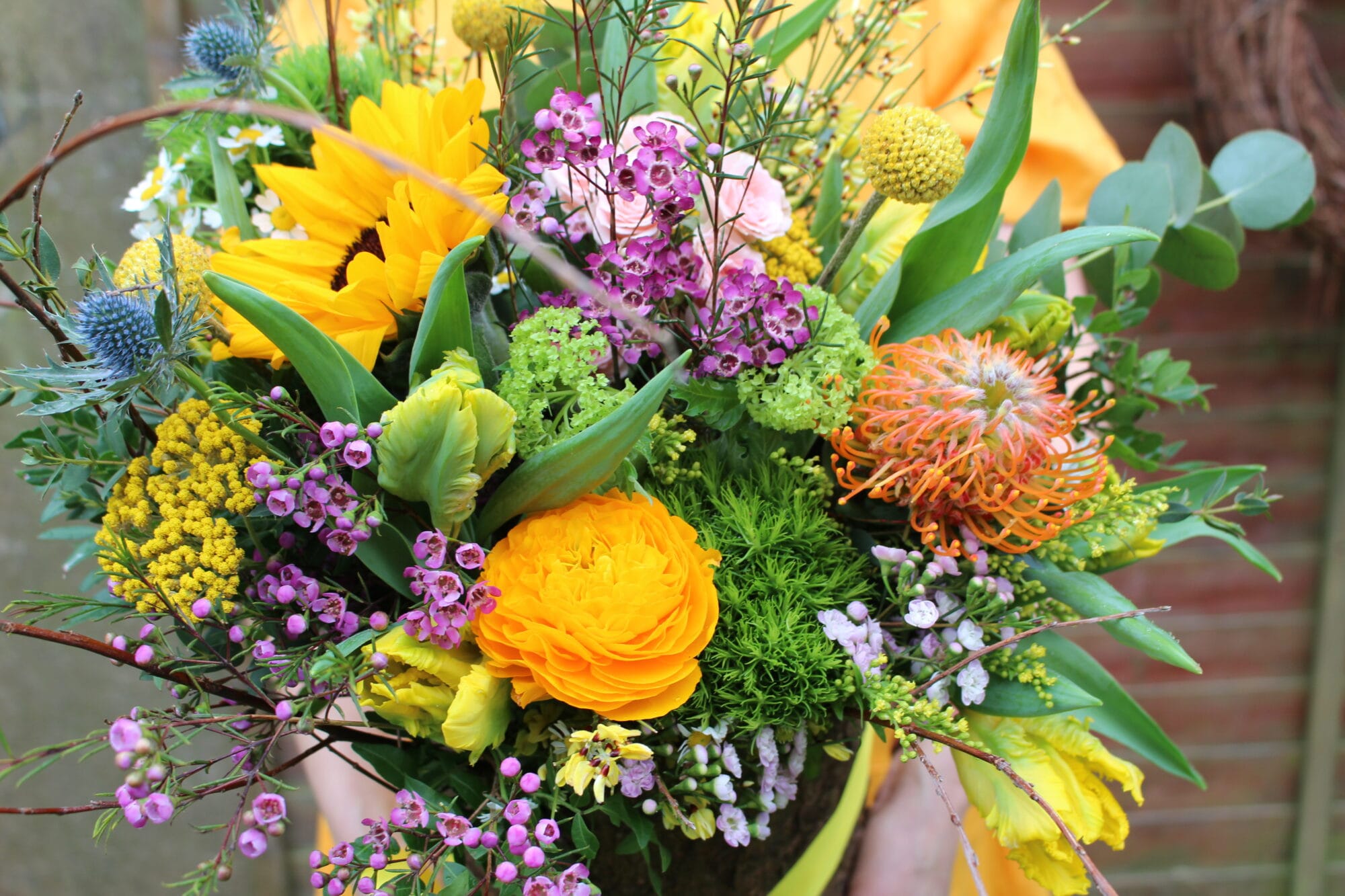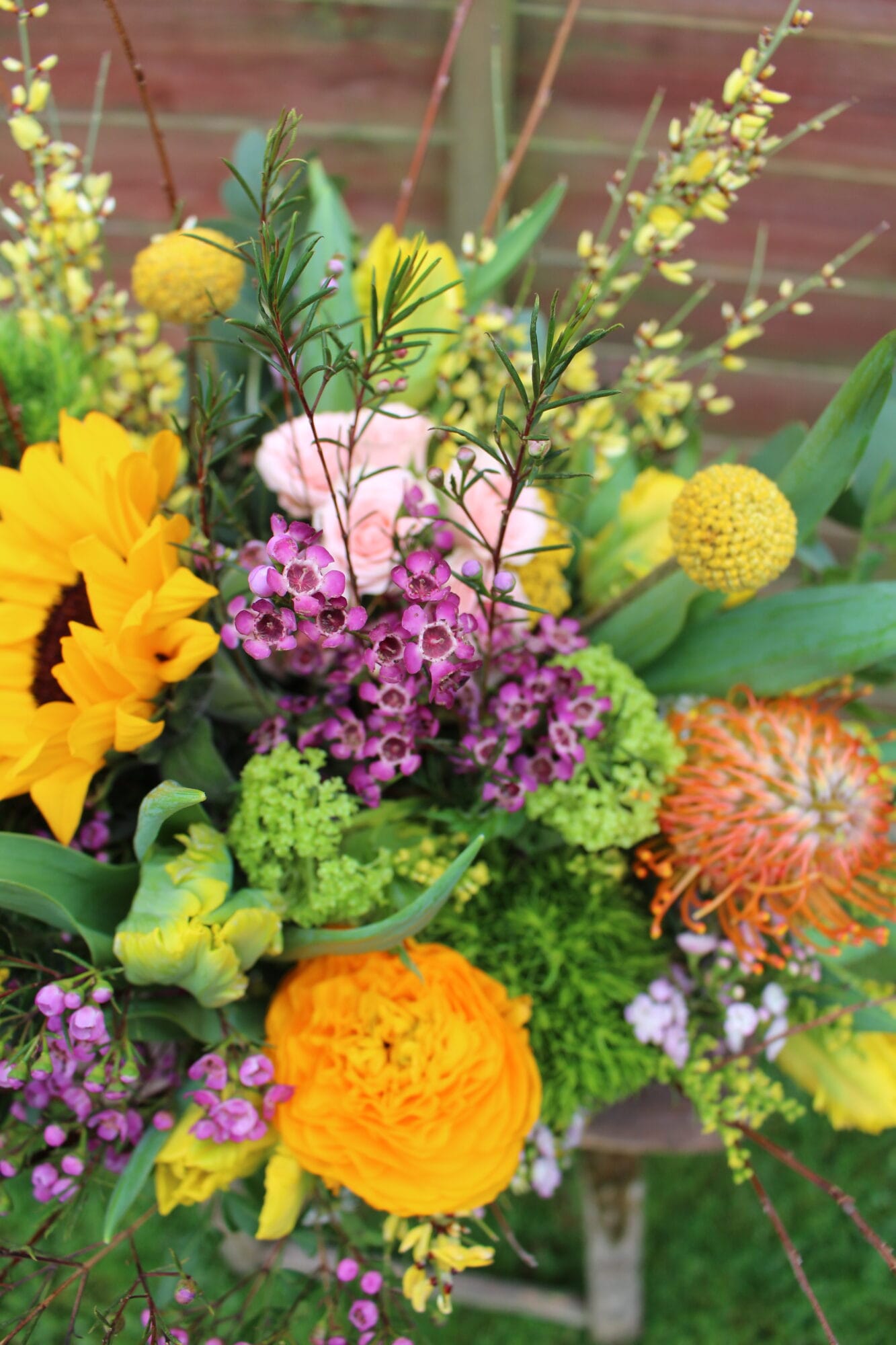 Each arrangement is created using a lively mix of blooms and textures - in the arrangement pictured, you'll find: cheerful sunflowers, sculptural leucospermum, delicate wax flower, playful craspedia, airy ammi, and the soft, ruffled beauty of ranunculus and parrot tulips. You may also spot thistles, achillea, september flower and other delightful surprises tucked among the foliage. Together they create a bouquet that feels fresh, abundant and a little bit wild — like a joyful wander through a summer garden.